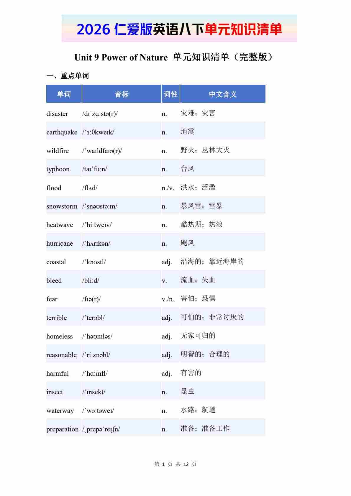 2026仁爱版英语八下单元知识清单 Unit 9