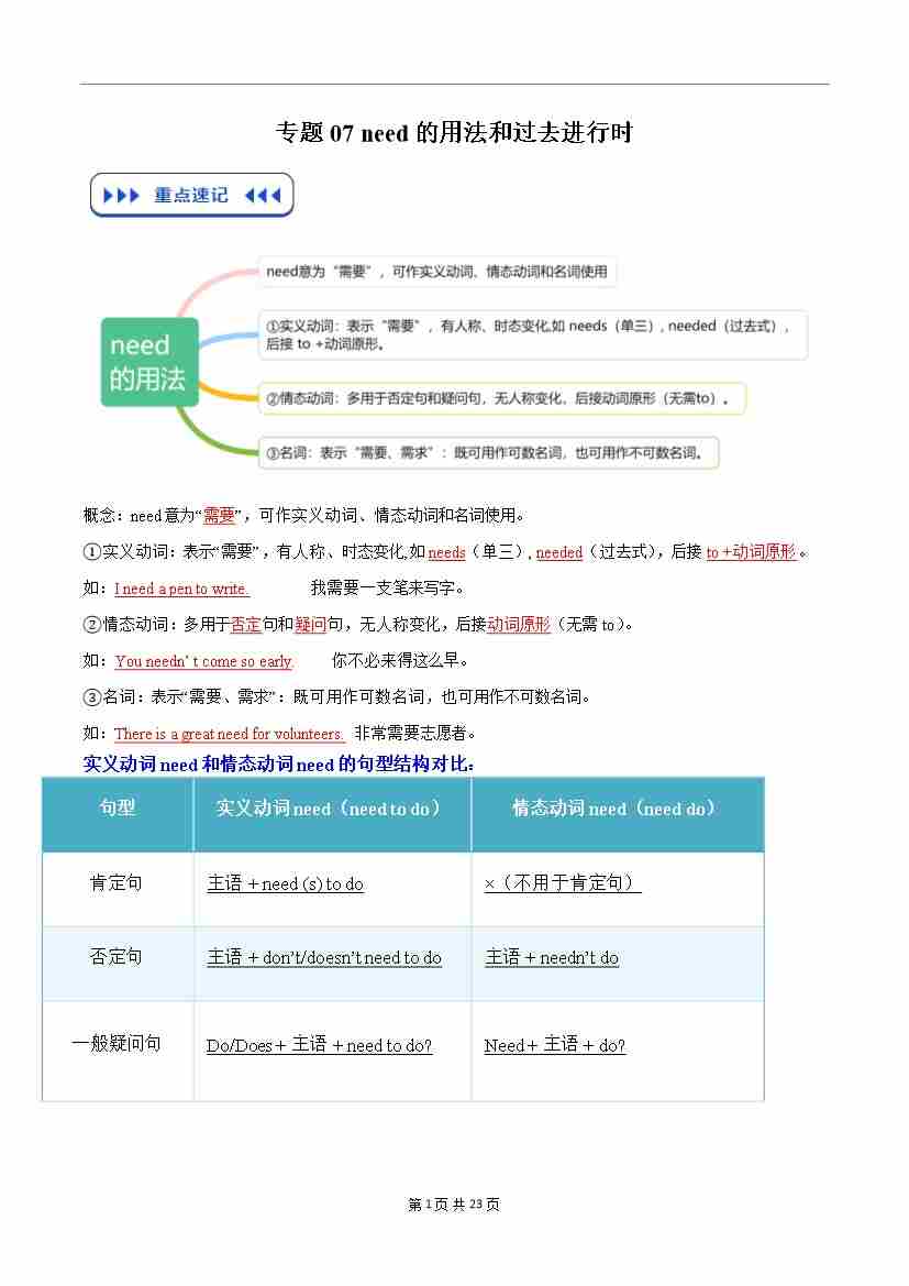专题07 need的用法和过去进行时(原卷版)