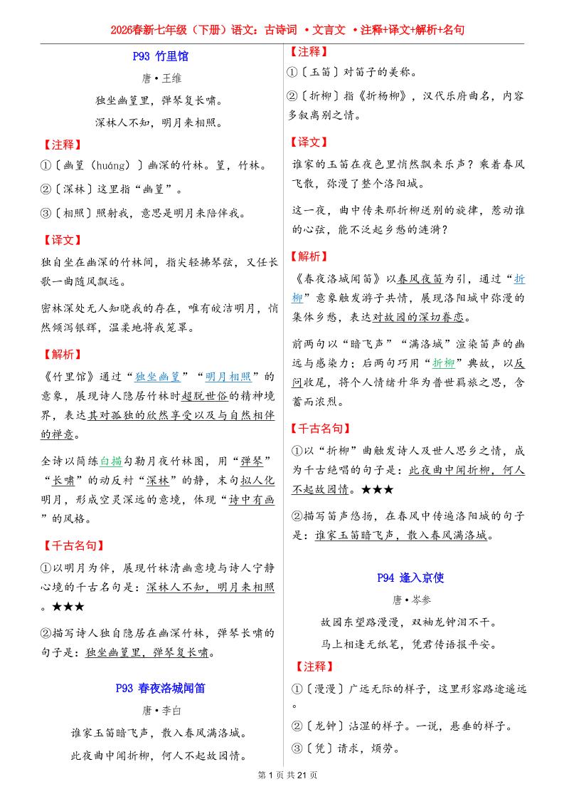 26春新七年级下册语文全册必背【古诗词&文言文】注释译文解析