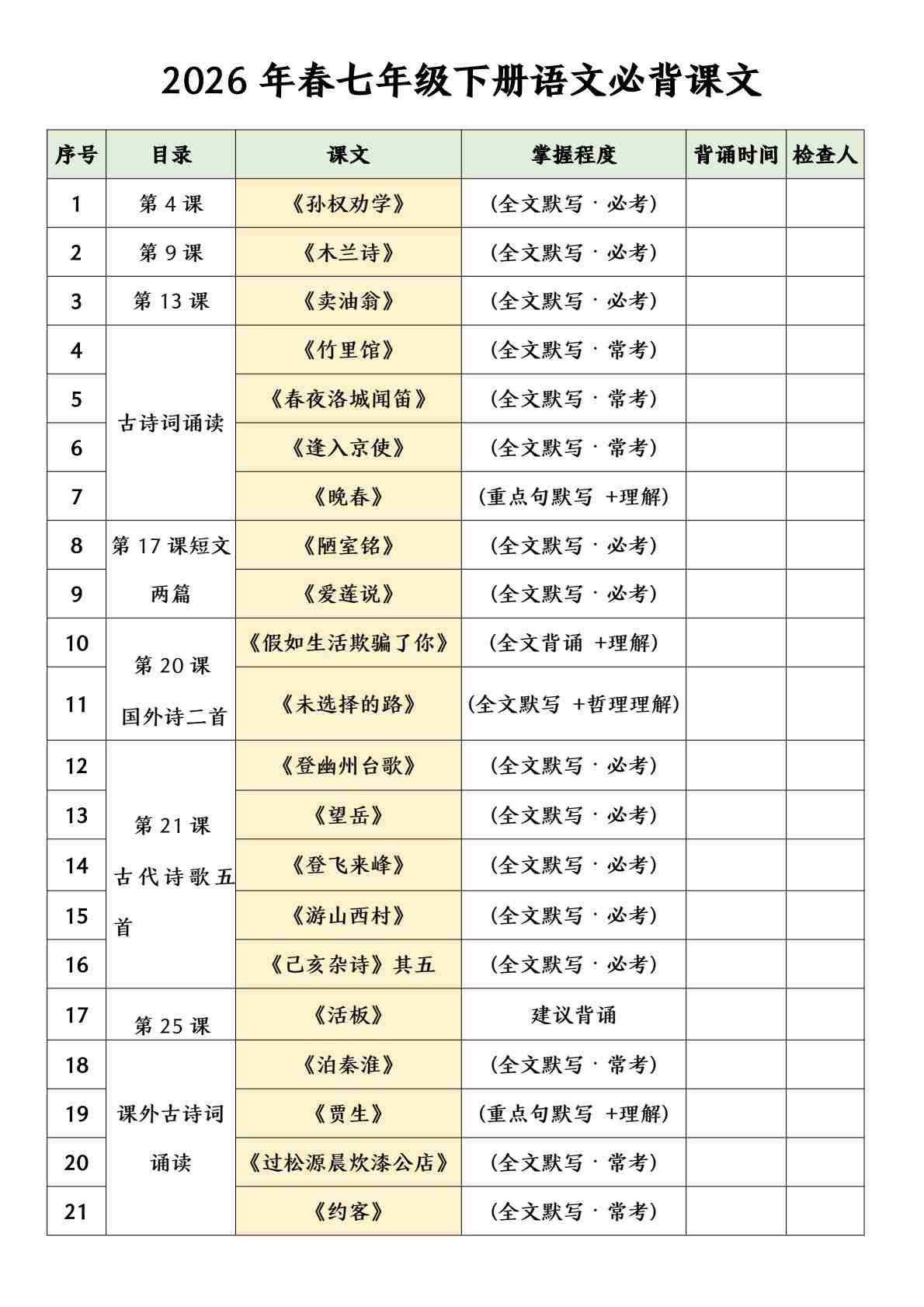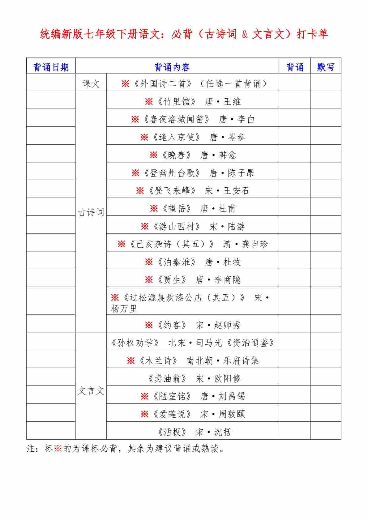 新七下语文必背【古诗词&文言文】打卡单