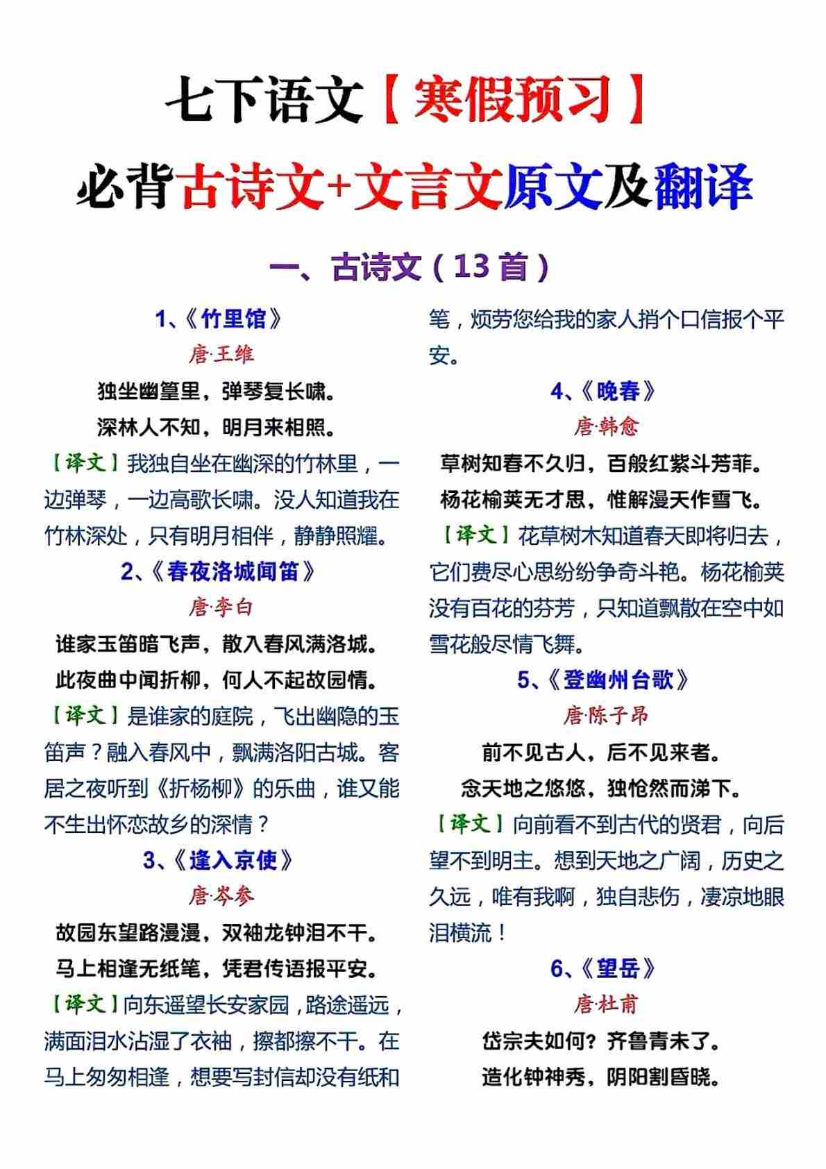 七下语文古诗文文言文寒假预习