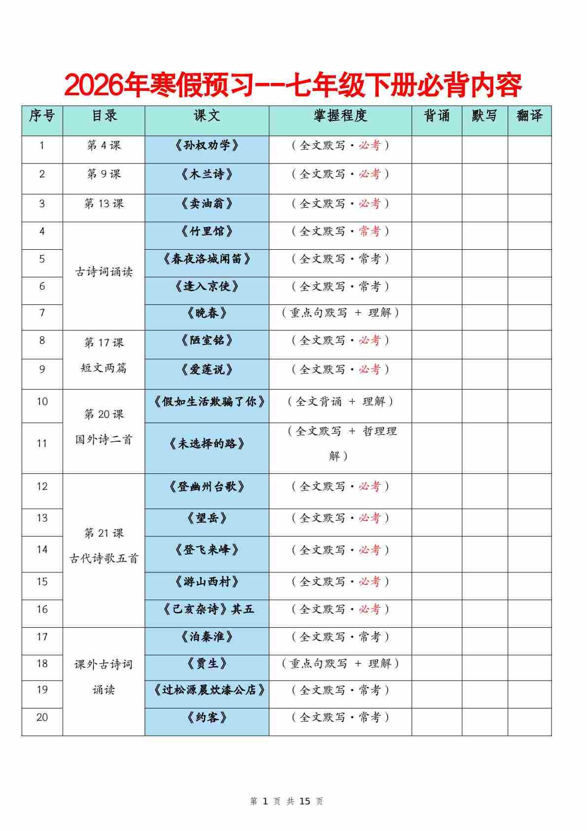 2026年寒假预习七年级下册必背课文。