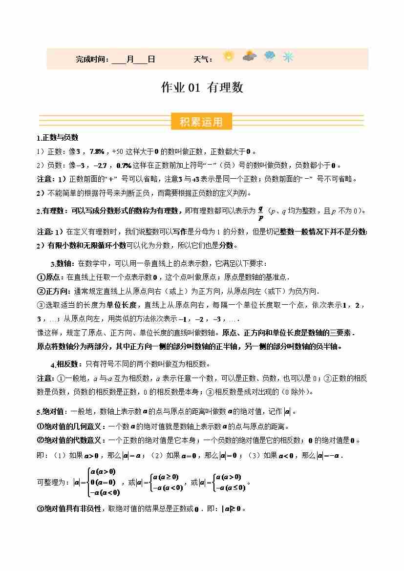 寒假作业01 有理数(巩固培优)(原卷版)