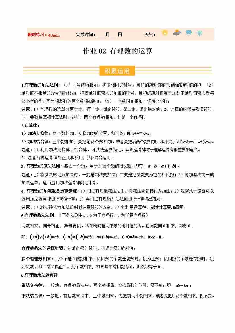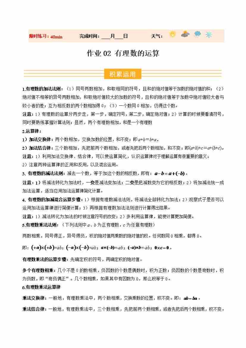 寒假作业02 有理数的运算(巩固培优)(原卷版)