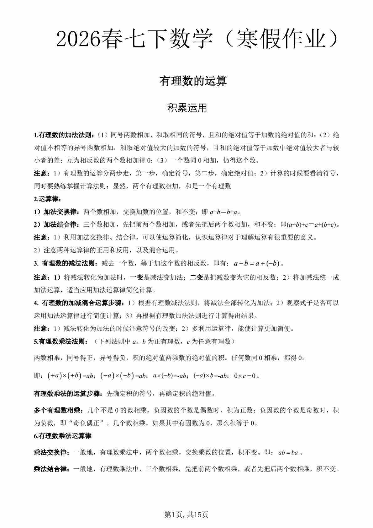 寒假作业02 有理数的运算(巩固培优)(原卷版)1