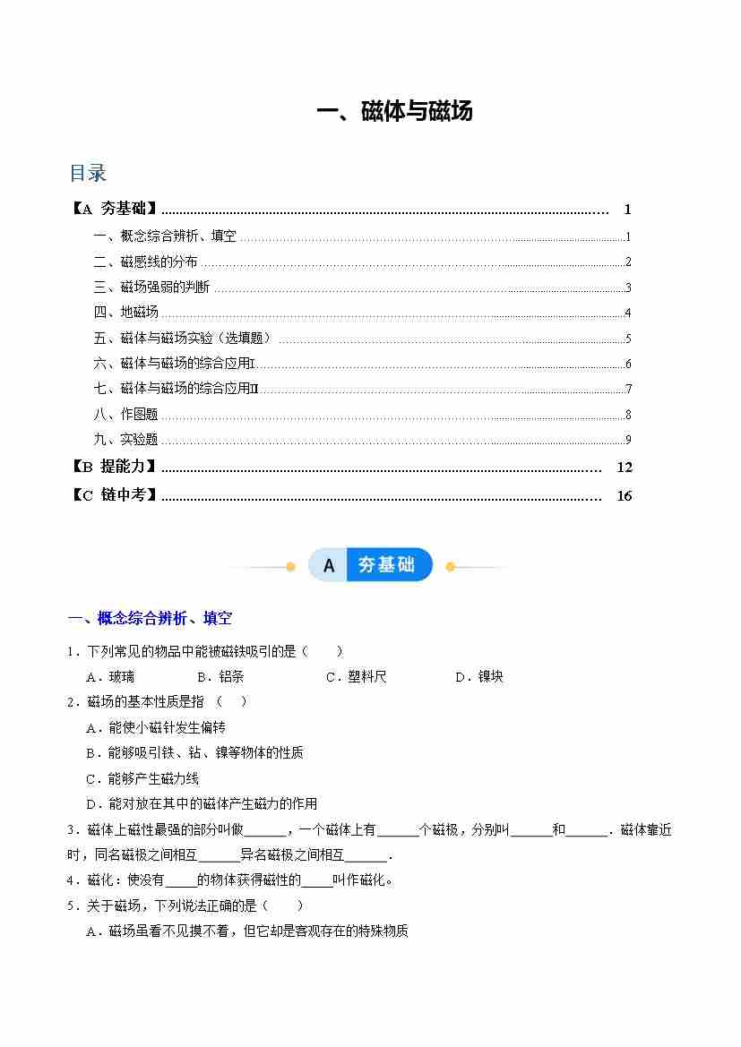 一、磁体与磁场(分层作业)(原卷版)