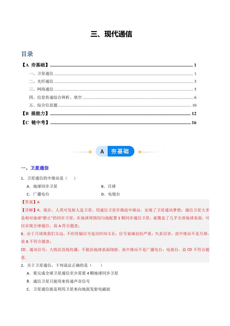 三、现代通信(分层作业)(原卷版)