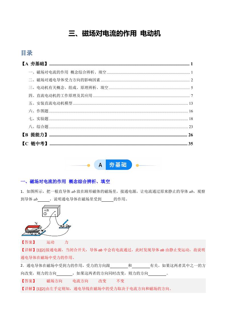 三、磁场对电流的作用 电动机(分层作业)(解析版)