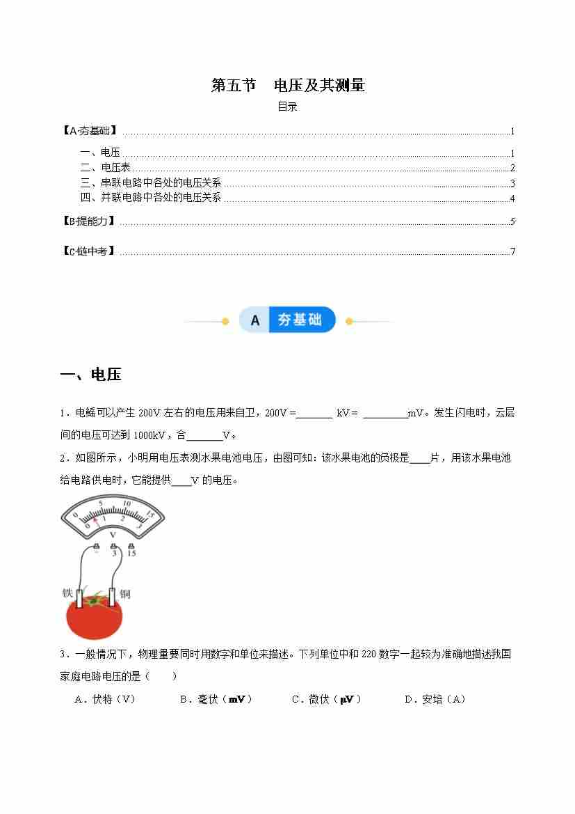 第十一章第五节 电压及其测量(分层作业)(原卷版)