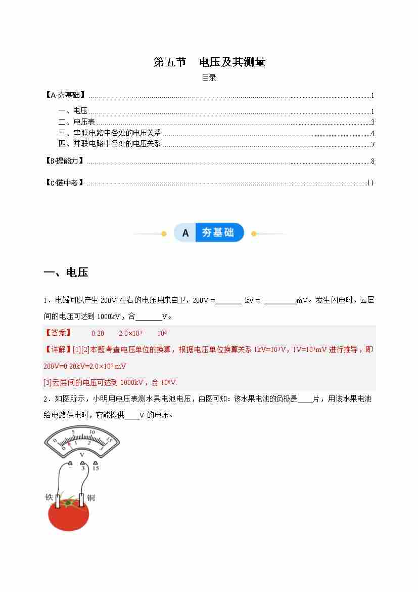 第十一章第五节 电压及其测量(分层作业)(解析版)