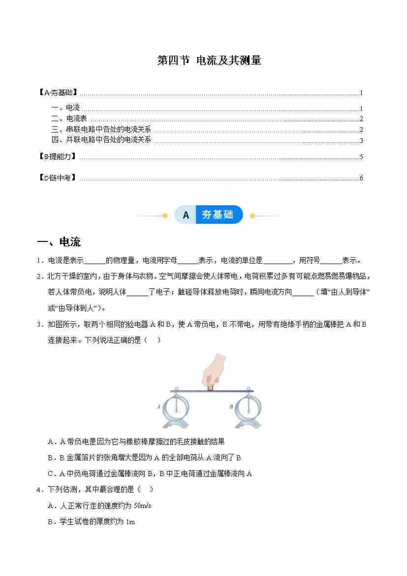 第十一章第四节 电流及其测量(分层作业)(原卷版)