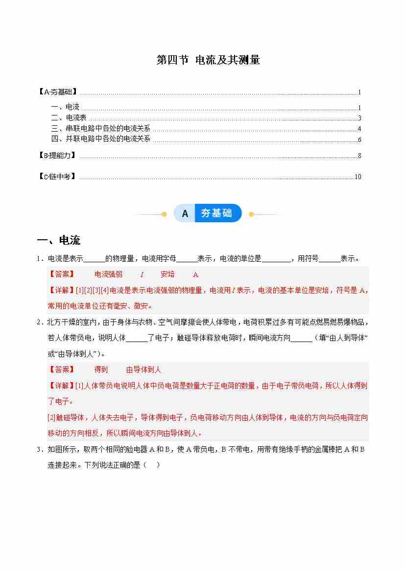 第十一章第四节 电流及其测量(分层作业)(解析版)