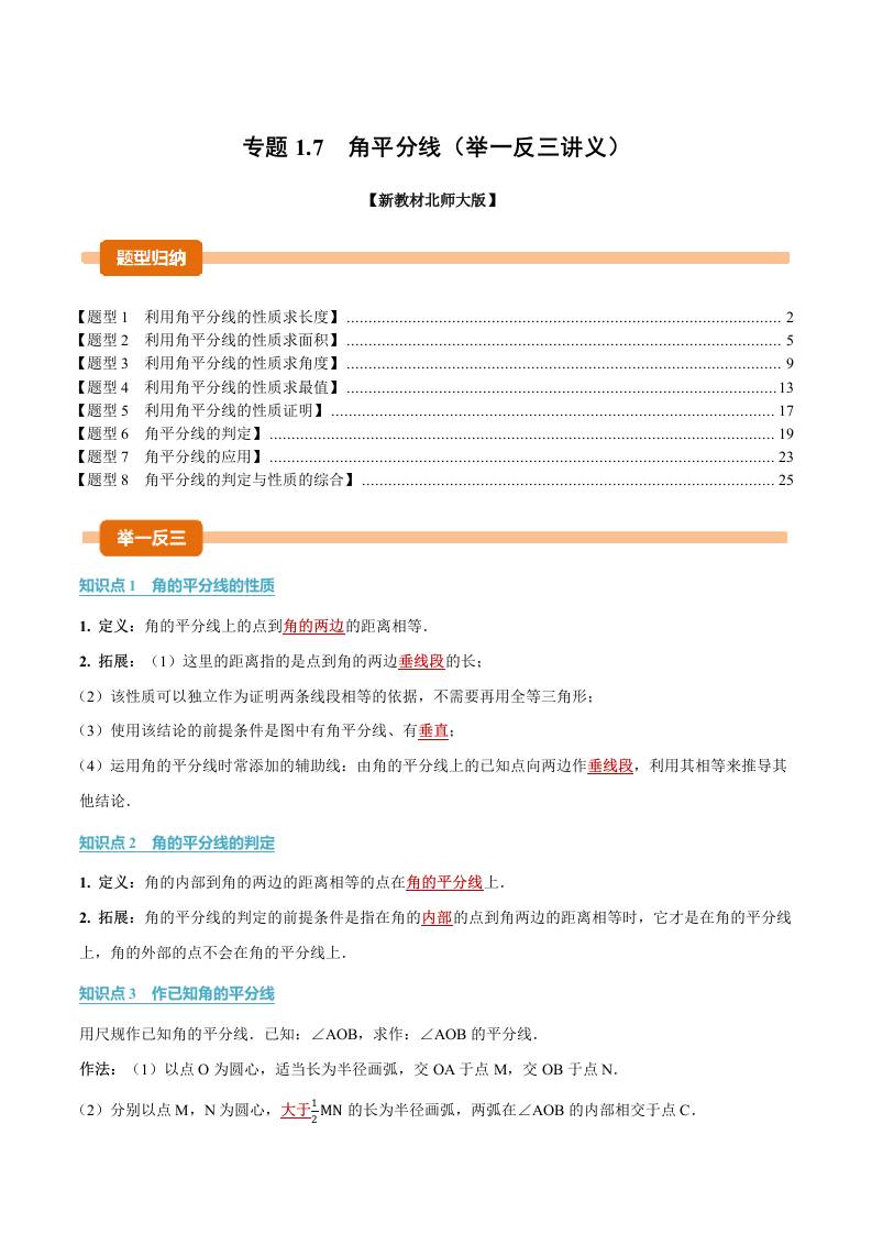 专题1.7 角平分线(举一反三讲义)(解析版)