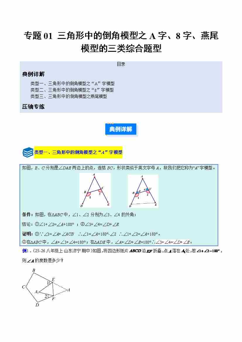 专题01 三角形中的倒角模型之A字、8字、燕尾模型的三类综合题型(压轴题专项训练)(原卷版)