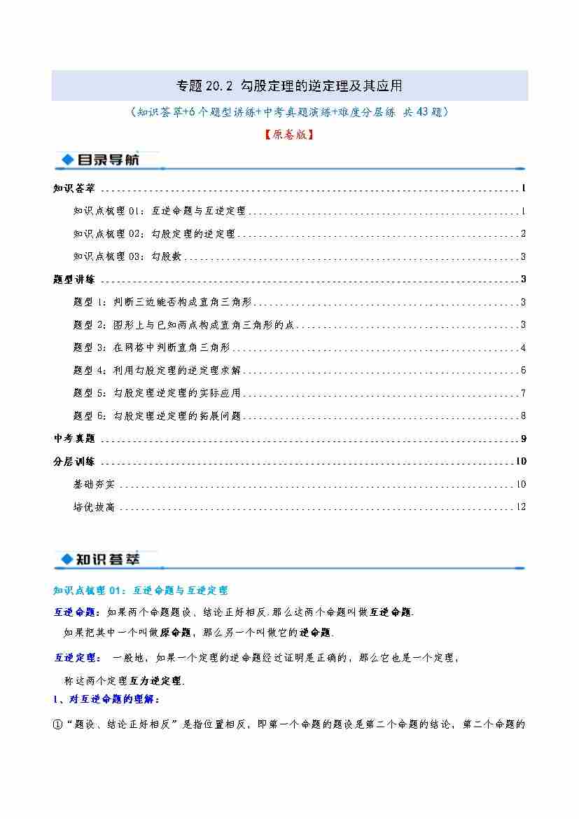 专题20.2 勾股定理的逆定理及其应用(知识荟萃6个题型讲练中考真题演练难度分层练 共43题)原卷版