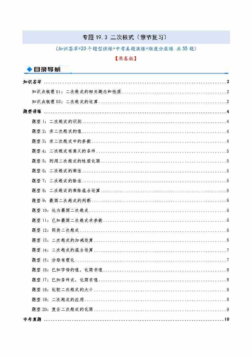 专题19.4 二次根式(章节复习)(知识荟萃20个题型讲练中考真题演练难度分层练 共55题)原卷版