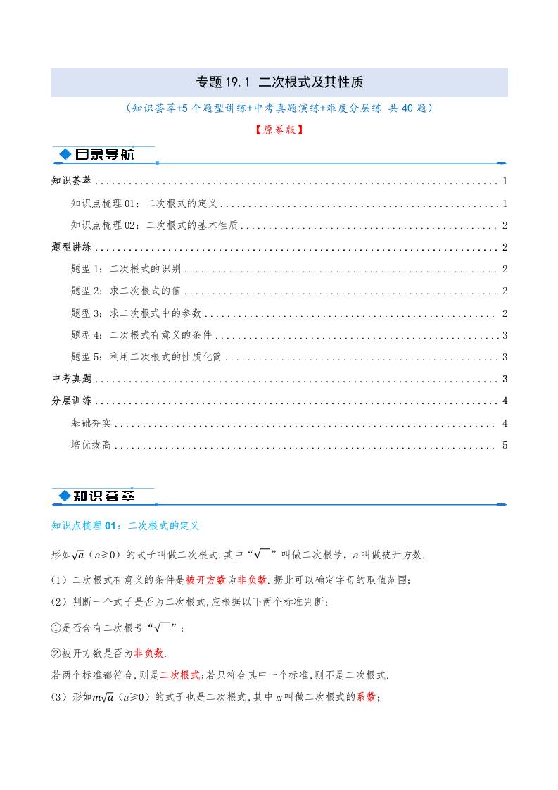 专题19.1 二次根式及其性质(知识荟萃5个题型讲练中考真题演练难度分层练 共40题)原卷版