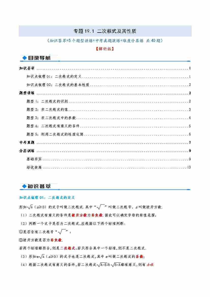 专题19.1 二次根式及其性质(知识荟萃5个题型讲练中考真题演练难度分层练 共40题)解析版