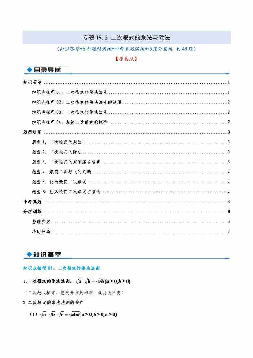 专题19.2 二次根式的乘法与除法(知识荟萃6个题型讲练中考真题演练难度分层练 共43题)原卷版