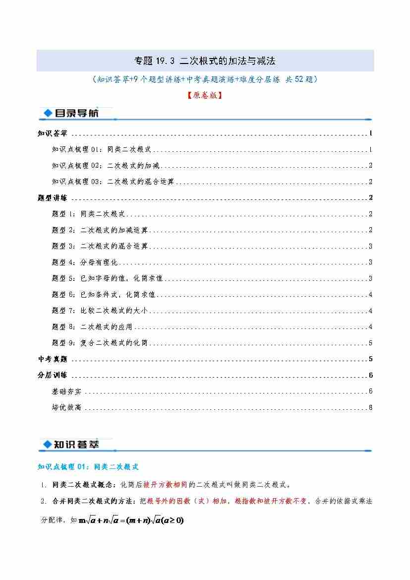 专题19.3 二次根式的加法与减法(知识荟萃9个题型讲练中考真题演练难度分层练 共52题)原卷版