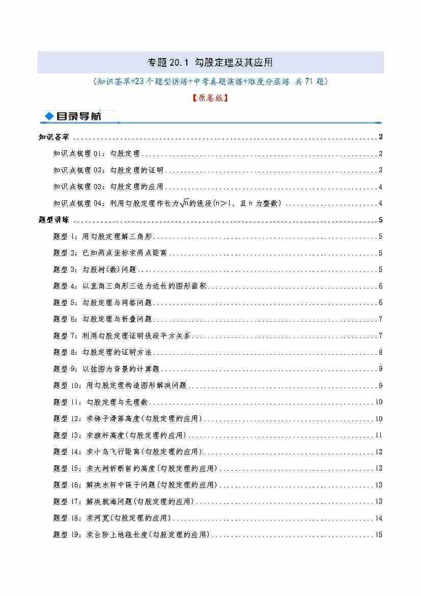 专题20.1 勾股定理及其应用(知识荟萃23个题型讲练中考真题演练难度分层练 共71题)原卷版
