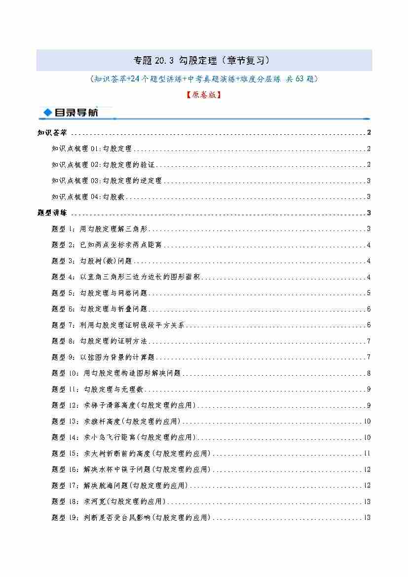 专题20.3 勾股定理(章节复习)(知识荟萃24个题型讲练中考真题演练难度分层练 共63题)原卷版