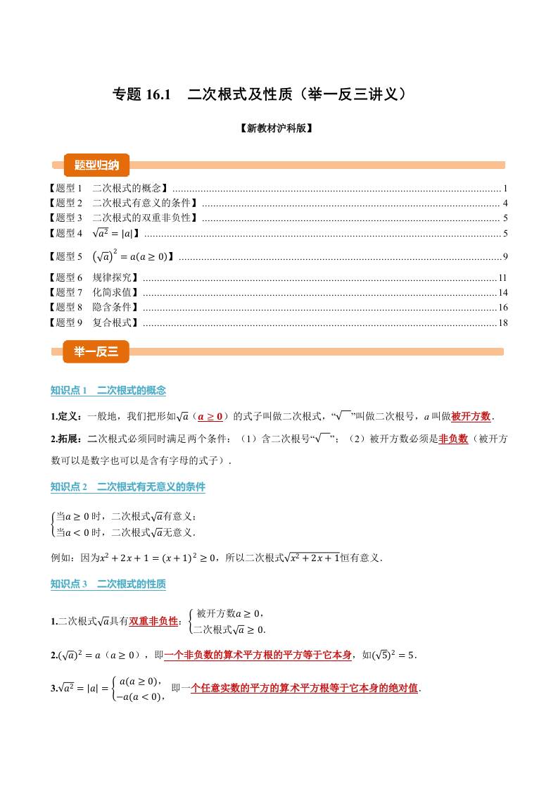 专题16.1 二次根式及性质(举一反三讲义)(解析版)