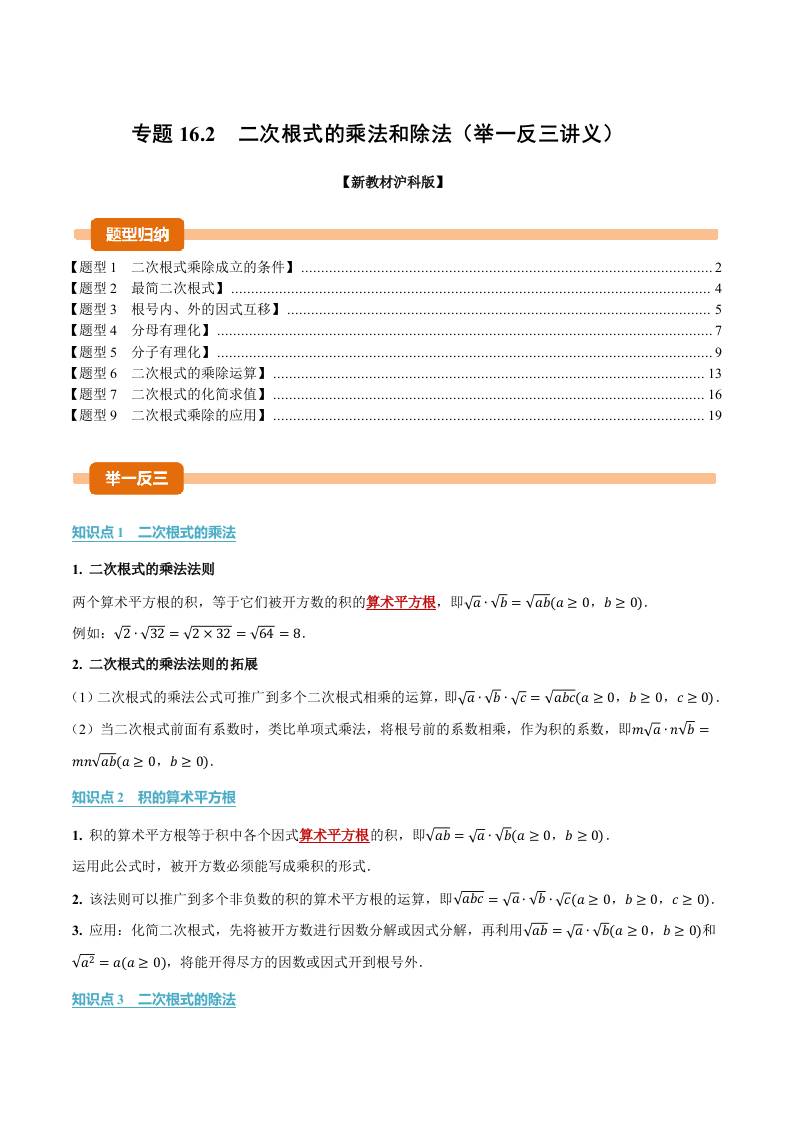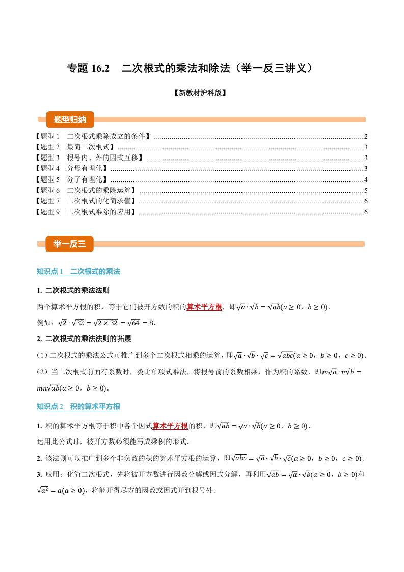专题16.2 二次根式的乘法和除法(举一反三讲义)(解析版)