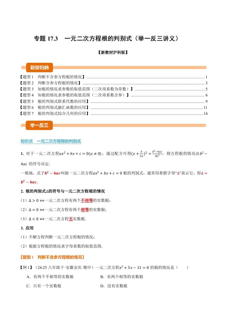 专题17.3 一元二次方程根的判别式(举一反三讲义)(解析版)