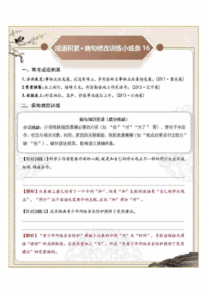 高考成语积累 (成分残缺赘余、表意不明)病句修改训练小纸条(学生版)