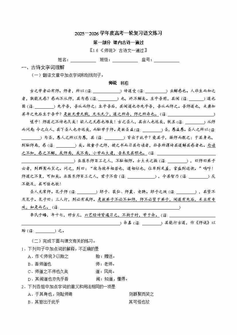 《师说》 古诗文一遍过〗教师版