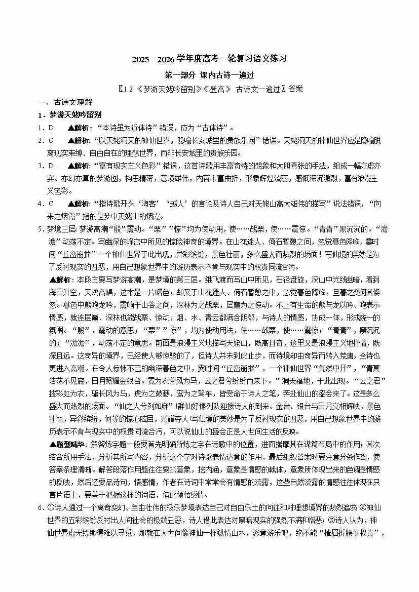 《梦游天姥吟留别》《登高》 答案