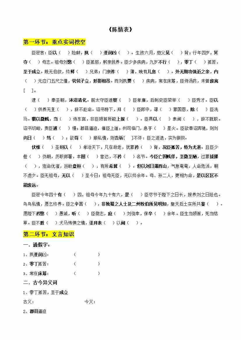 专题11 陈情表、项脊轩志(文言文挖空训练)(全国通用)(学生版)