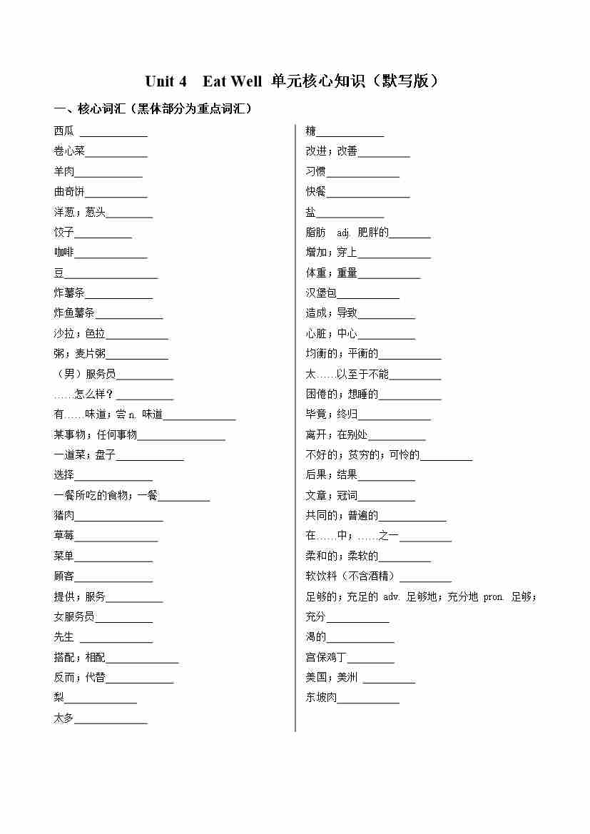 Unit 4 Eat Well 单元核心知识(背诵默写任务单)(默写版)