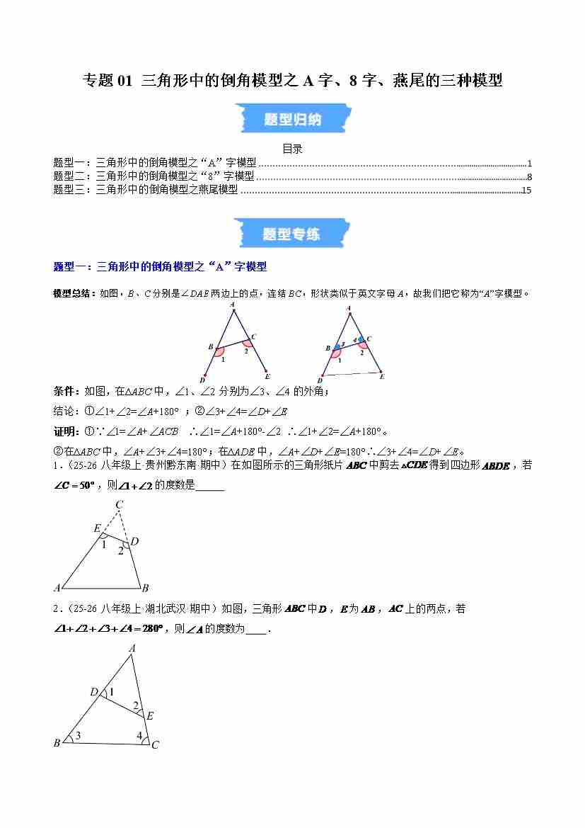 专题01 三角形中的倒角模型之A字、8字、燕尾的三种模型(高效培优专项训练)(原卷版)