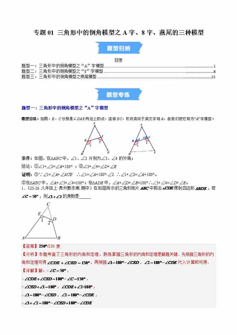专题01 三角形中的倒角模型之A字、8字、燕尾的三种模型(高效培优专项训练)(解析版)