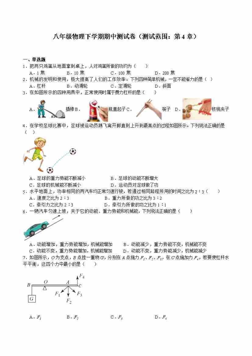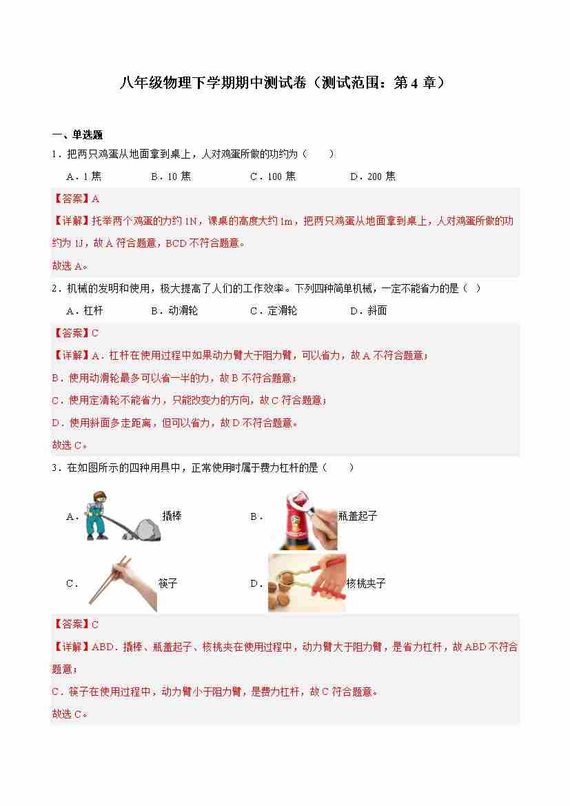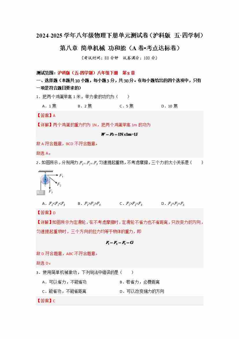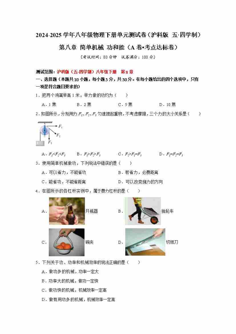第八章 简单机械 功和能(A卷 达标卷)(学生版)