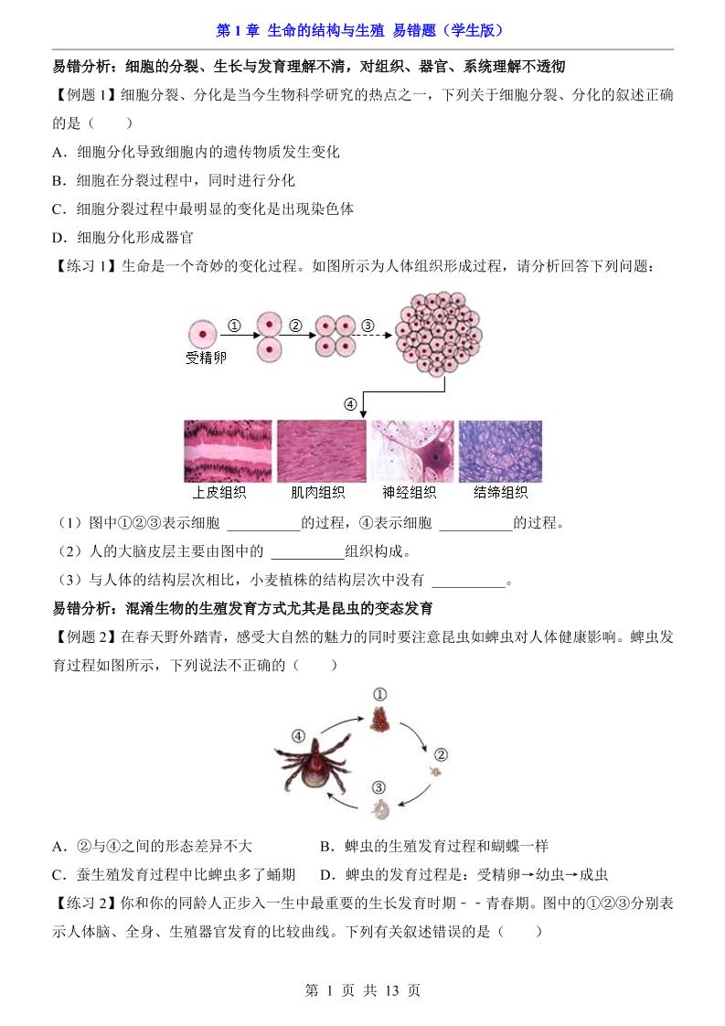 第1章 生命的结构与生殖(易错题)