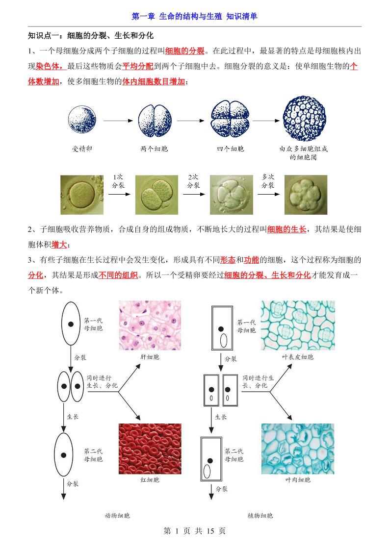 第1章 生命的结构与生殖(知识清单)