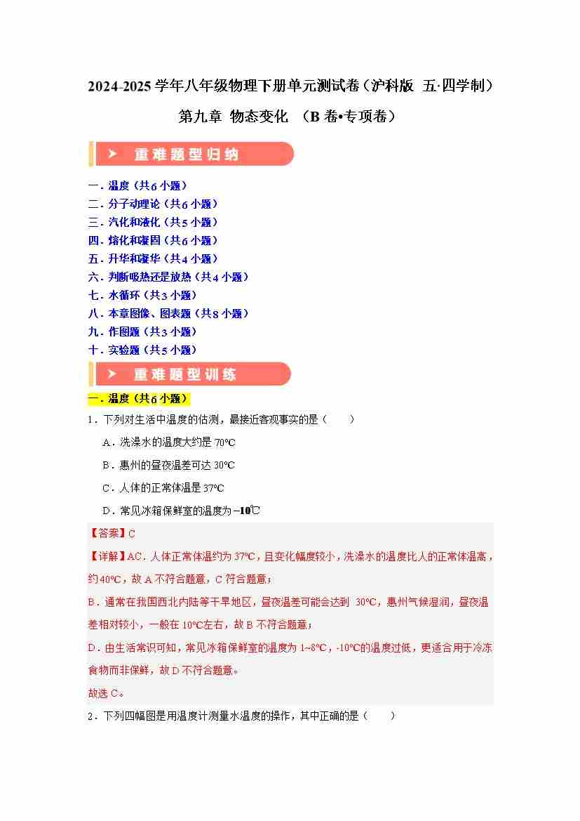 第九章 物态变化 (B卷 专项卷)(重难训练50题十大考点)(教师版)