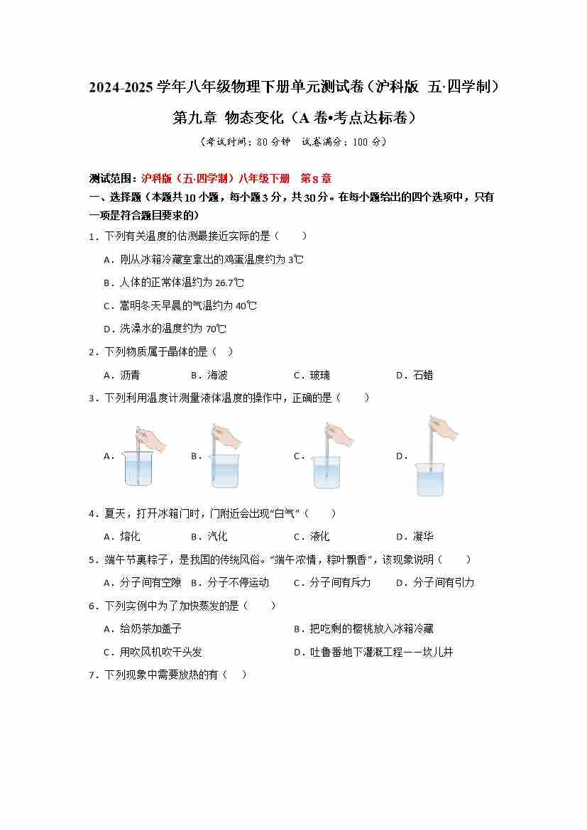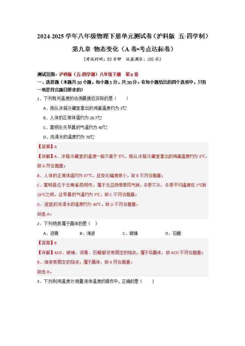 第九章 物态变化(A卷 达标卷)(学生版)