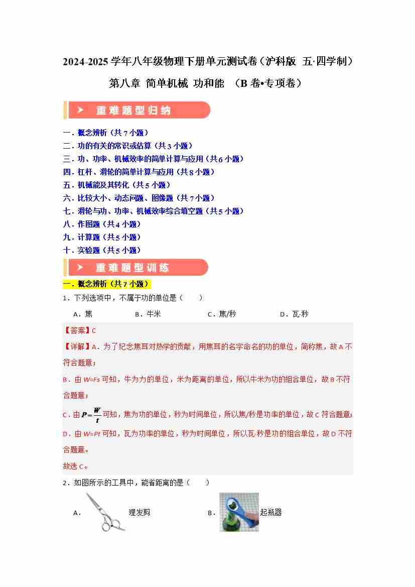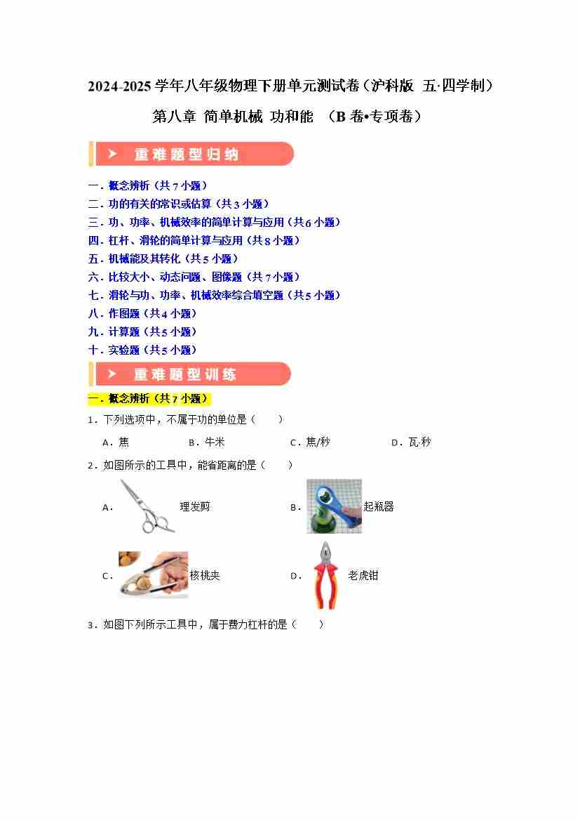 第八章 简单机械 功和能 (B卷 专项卷)(重难训练55题十大考点)(学生版)