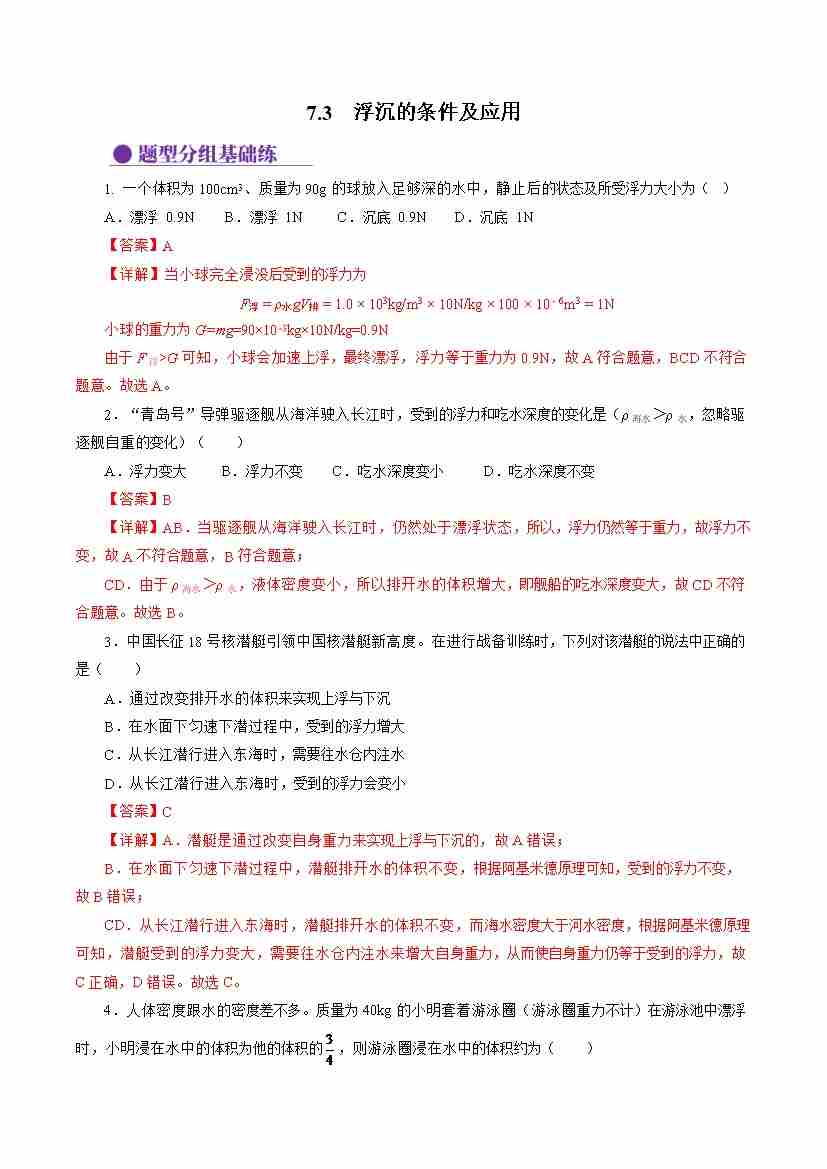 7.3 浮沉的条件及应用(分层作业)【解析版】