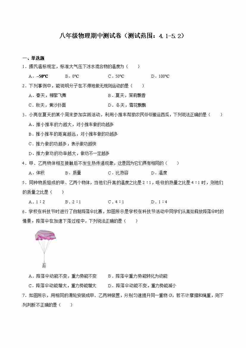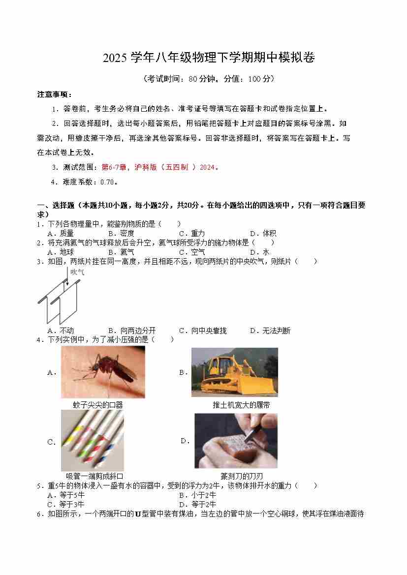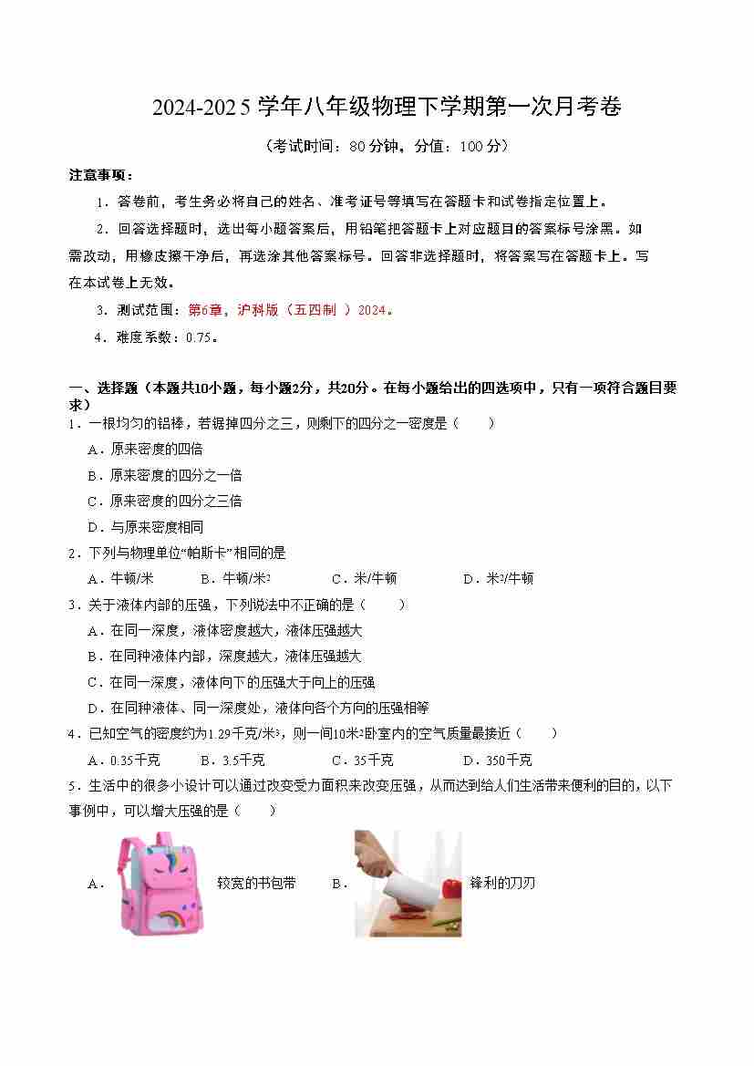 八年级物理第一次月考卷(考试版)【测试范围:沪科版(五四制 )】