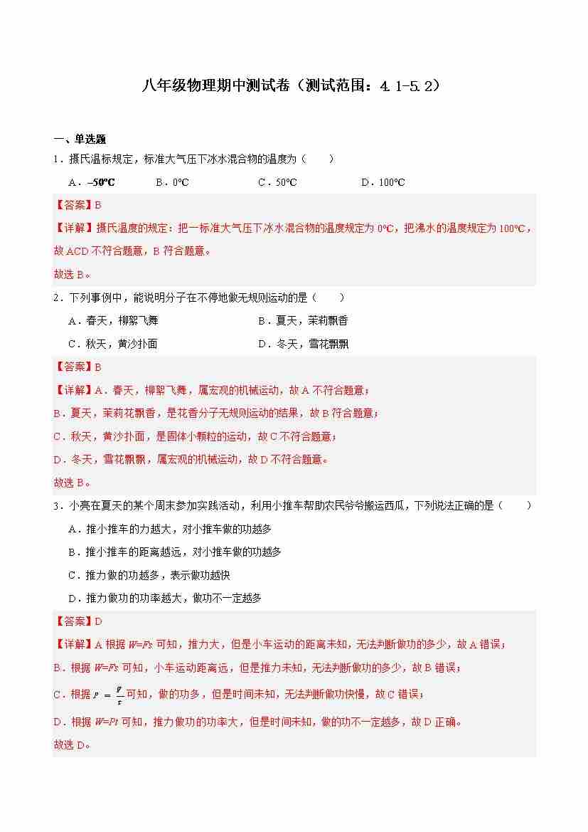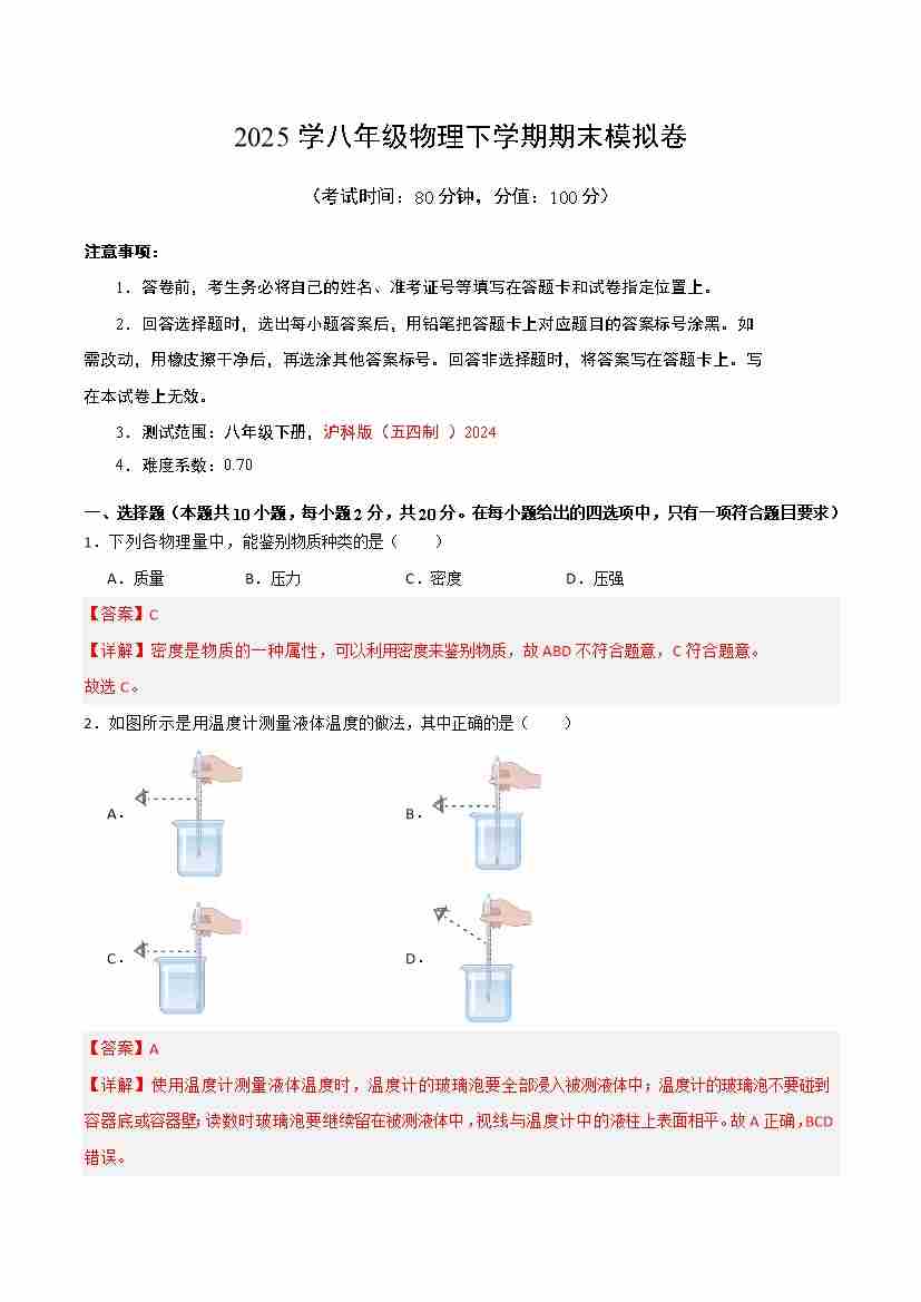 八年级物理期末模拟卷(全解全析)(上海专用)