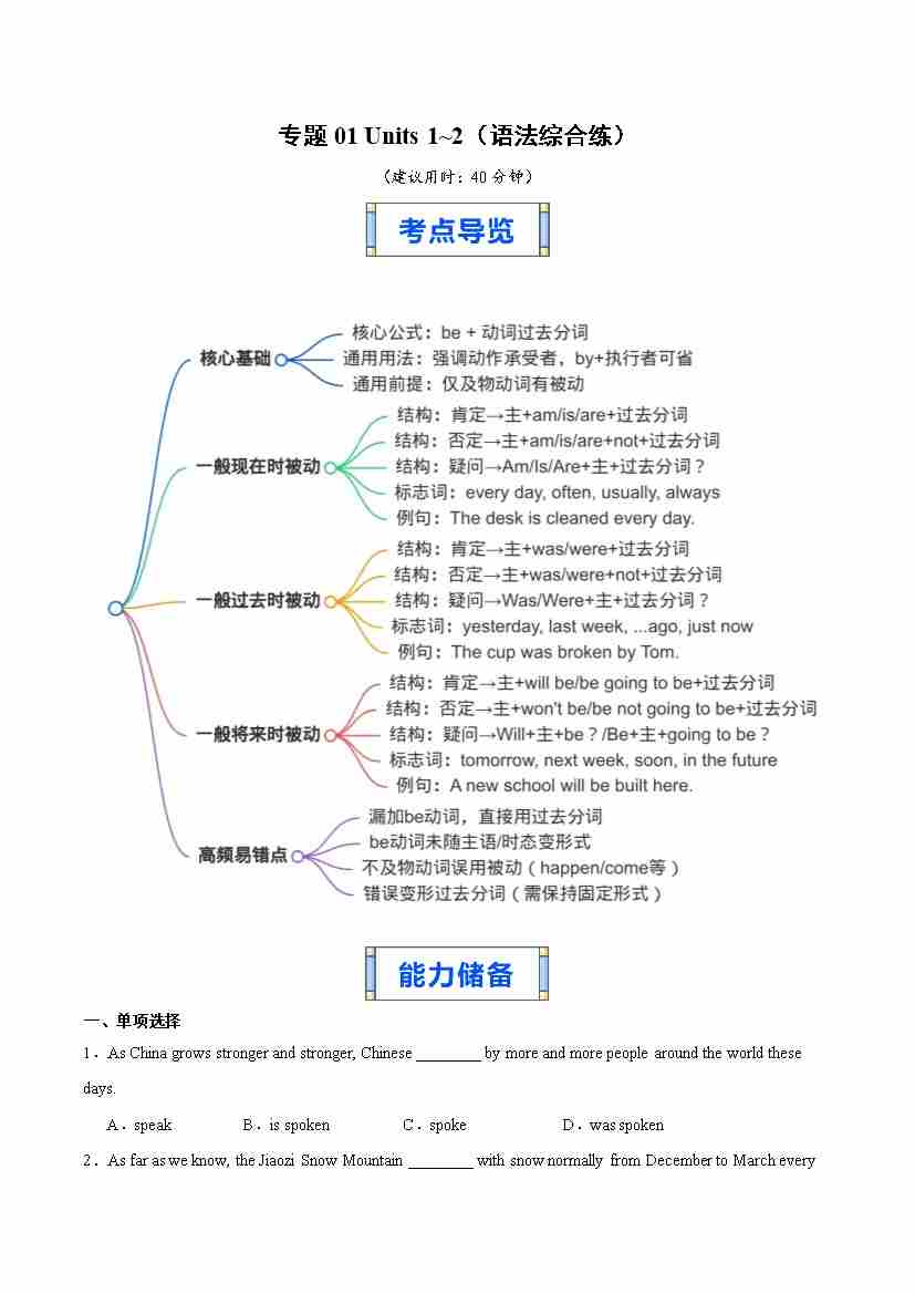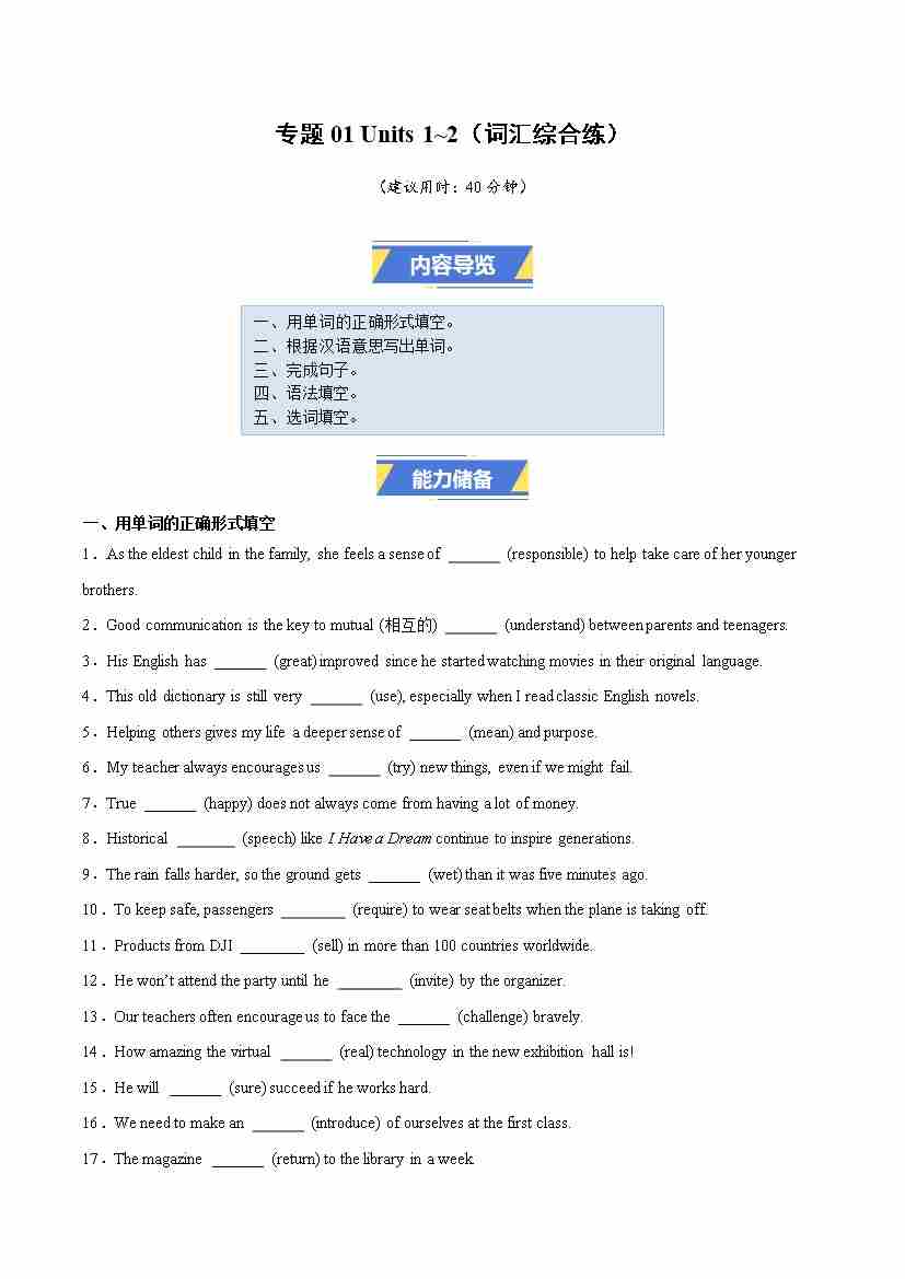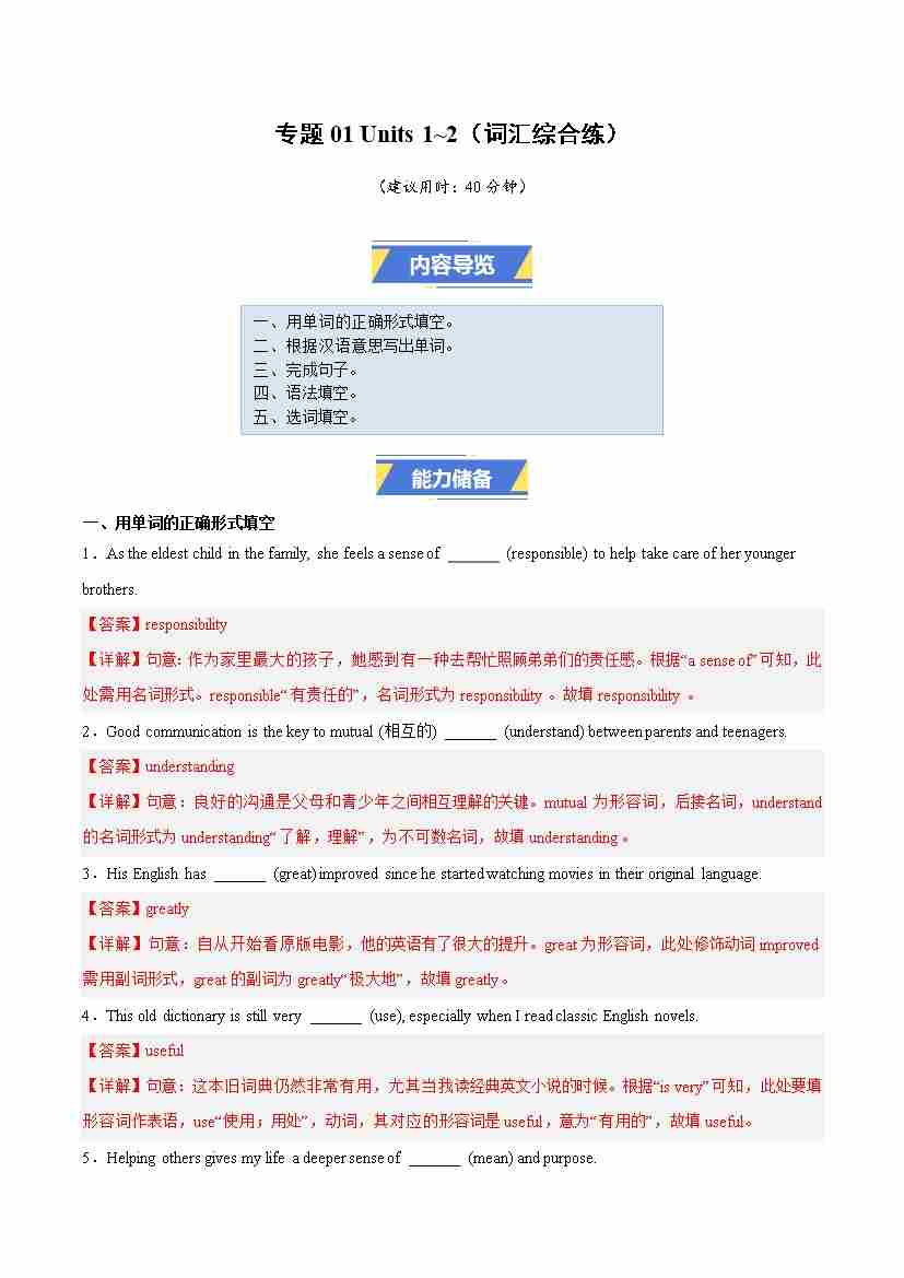 专题01 Units 1~2(词汇综合练)(原卷版)