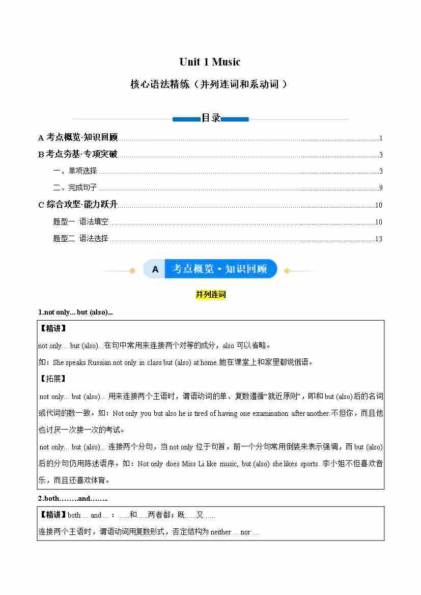 Unit 1 Music 并列连词和系动词(单元核心语法精练)(解析版)