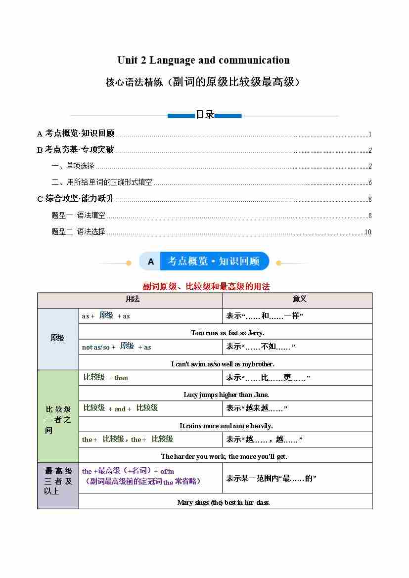 Unit 2 Language and communication 副词的原级比较级最高级(单元核心语法精练)(原卷版)