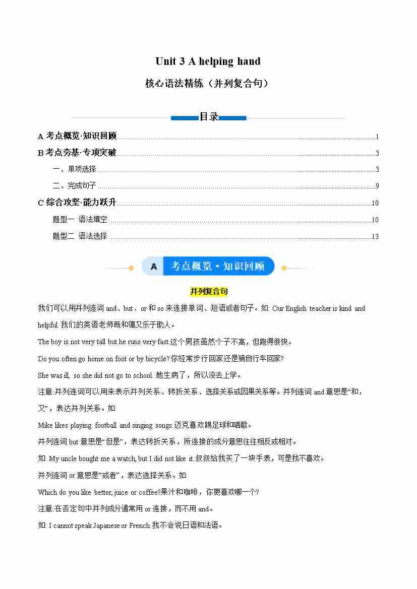 Unit 3 A helping hand 并列复合句(单元核心语法精练)(原卷版)