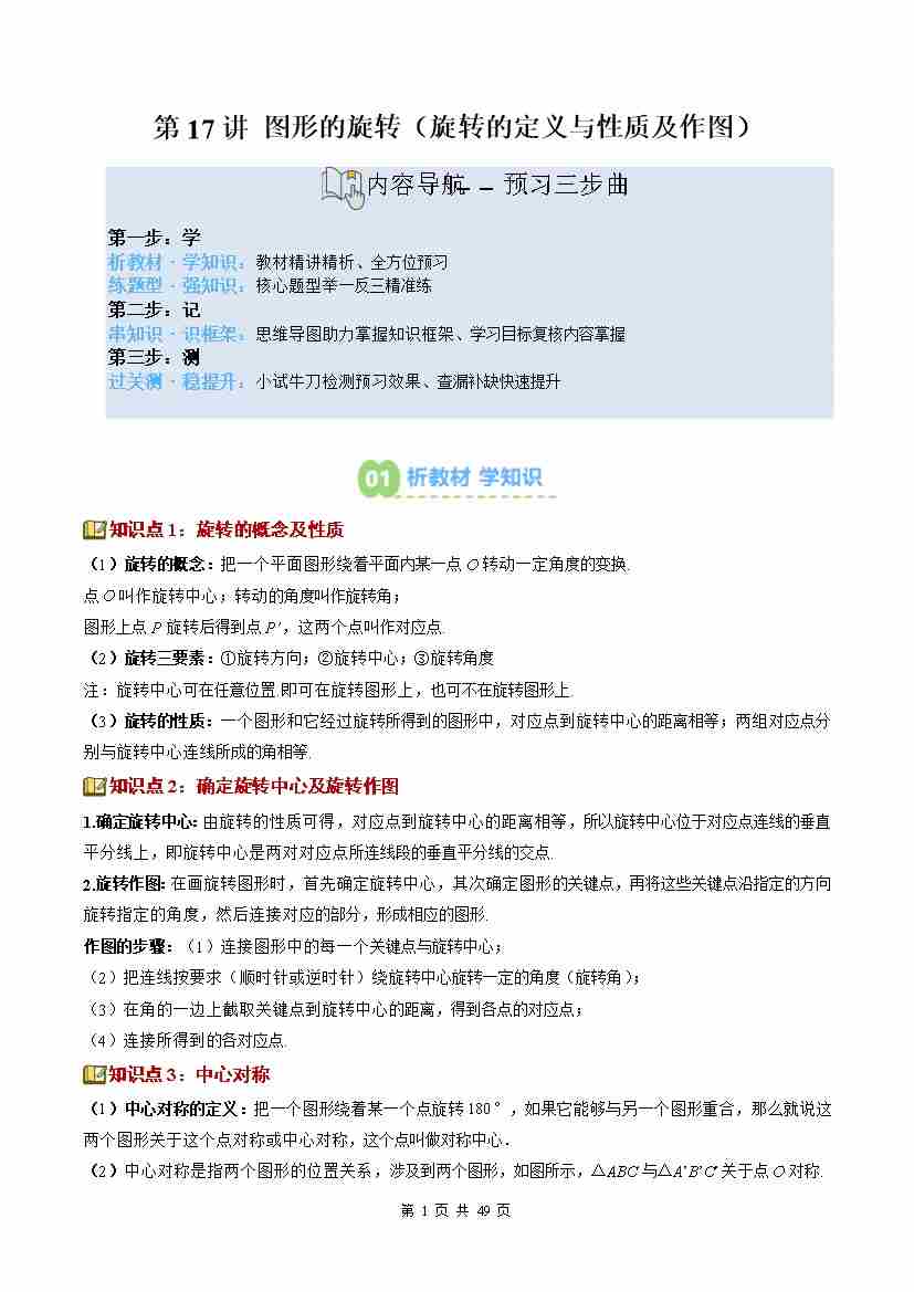 ②寒假预习-第17讲 图形的旋转(旋转的定义与性质及作图)(4知识点12大题型过关测)(教师版)八年级数学新教材北师大版-2026学年八年级数学寒假衔讲练